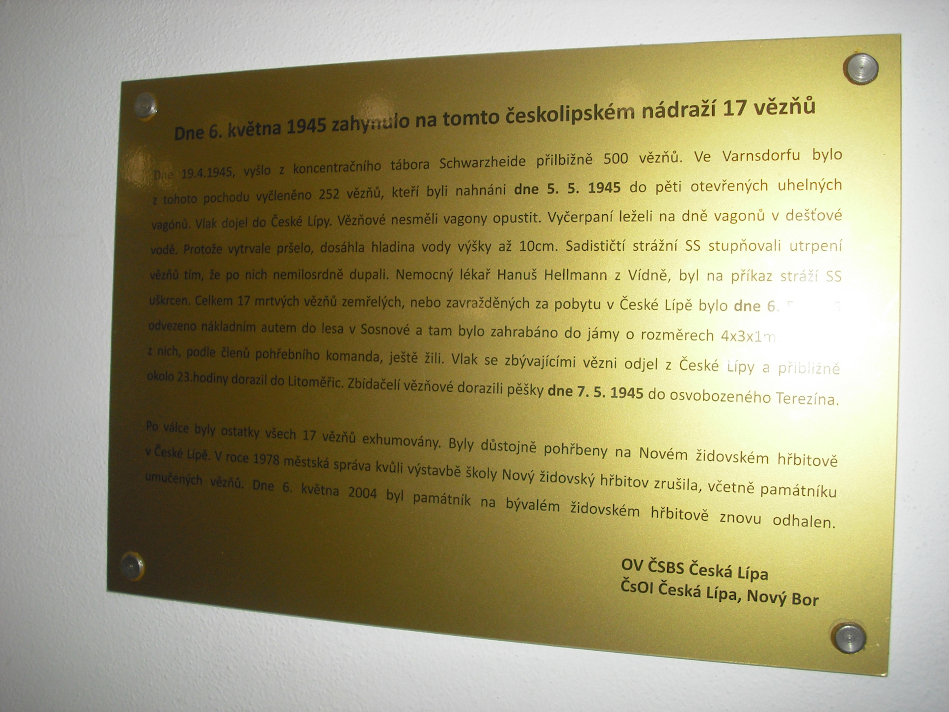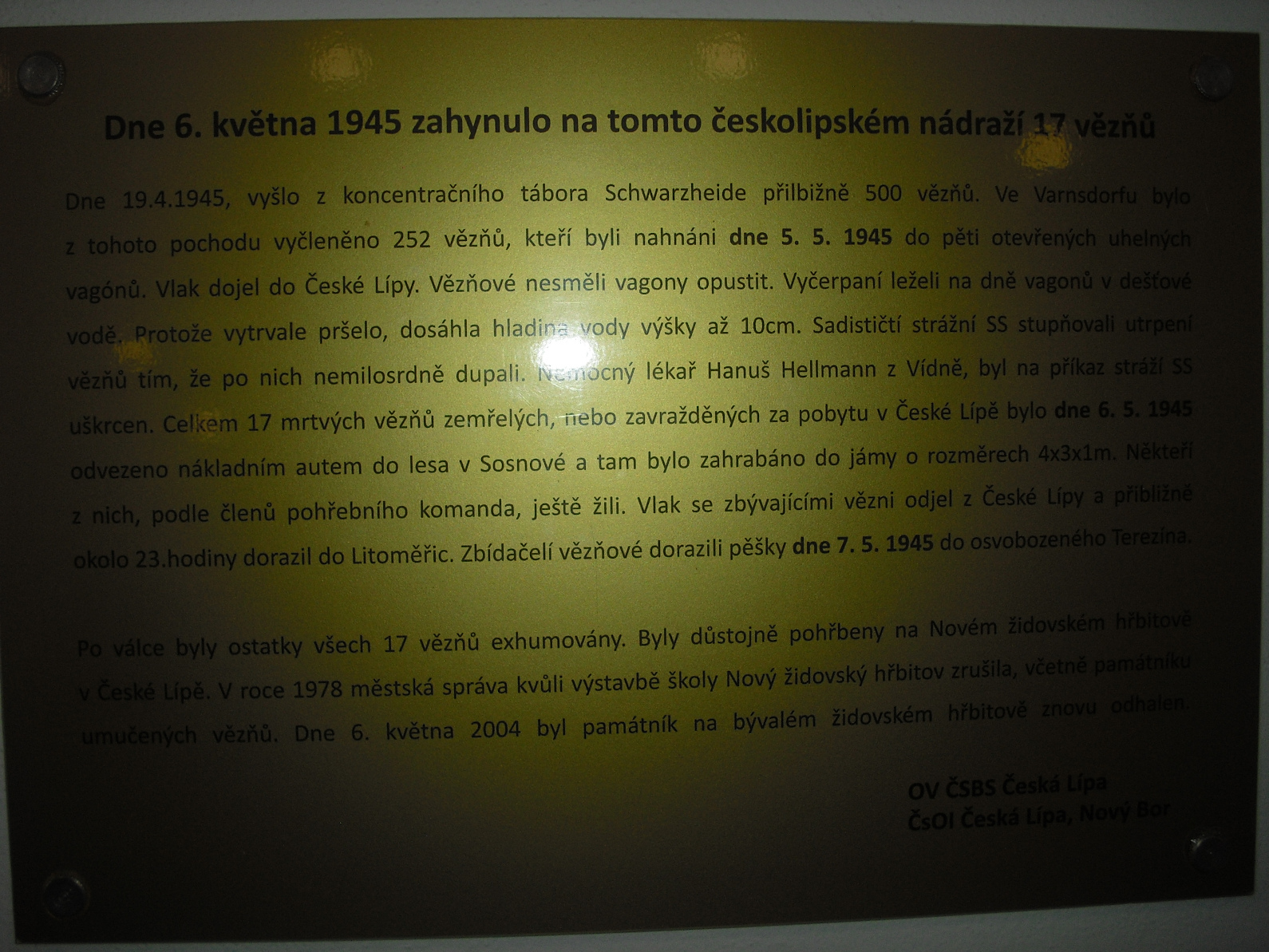 Z vlaku bylo v České Lípě vyloženo 17 mrtvých vězňů a pohřbeno v lese u Sosnové. V říjnu 1945 byla těla exhumována a převezena na místní židovský hřbitov.