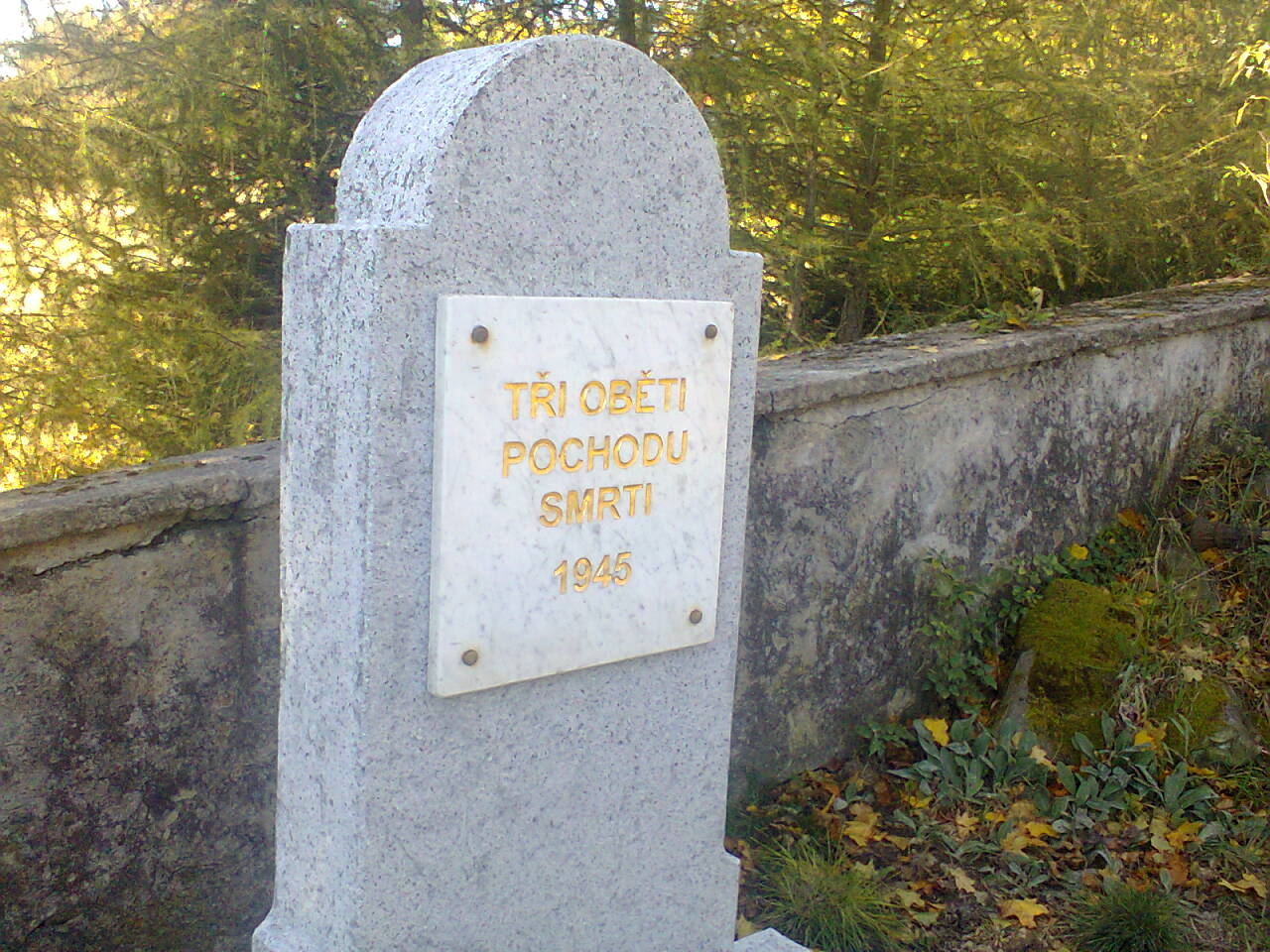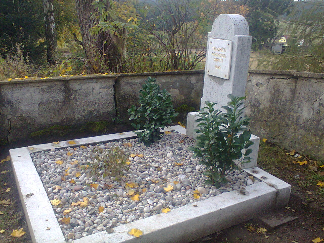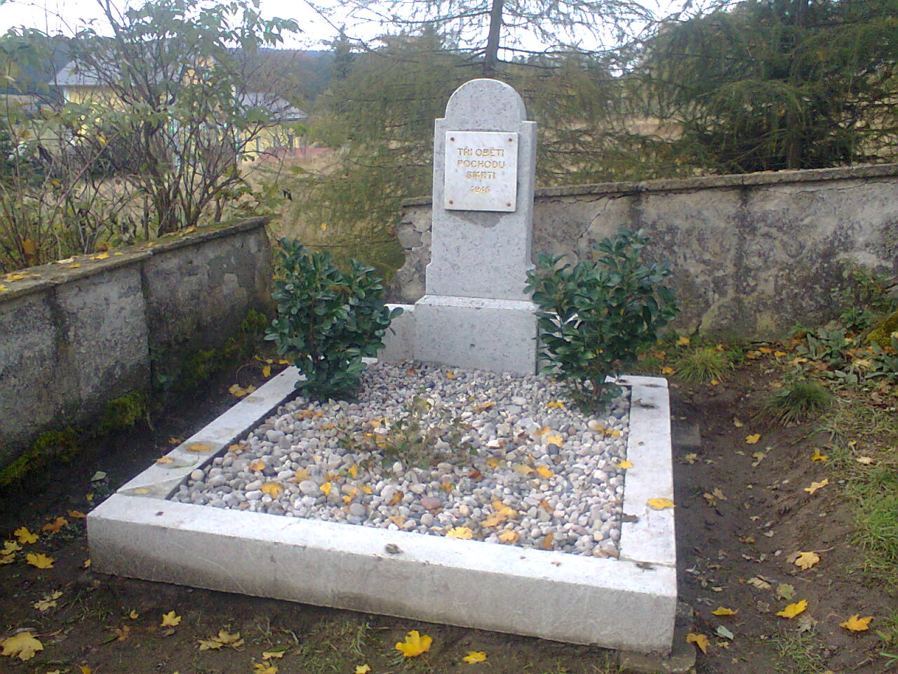 Hrob byl opraven v roce 2014. [2] Na pomníku je připevněna deska s nápisem: “TŘI OBĚTI POCHODU SMRTI 1945“. [3]