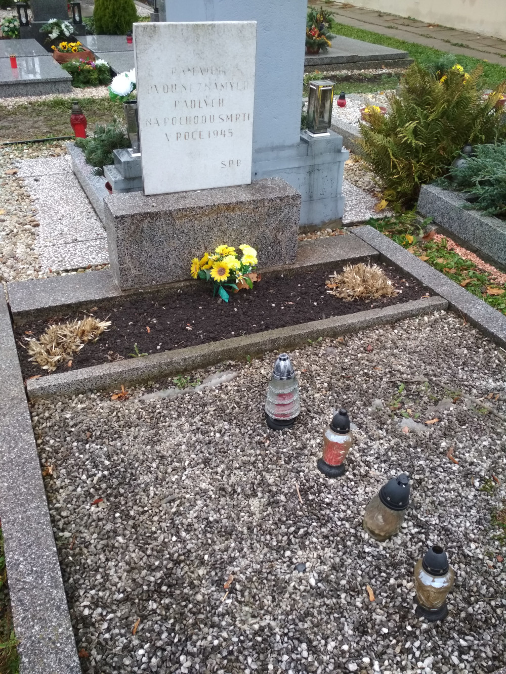 V opavské čtvrti Jaktař na hřbitově[1] u kostela sv. Petra a Pavla [2] se nachází hrob s bílým mramorovým náhrobkem, na němž je zlatým písmem napsáno „Památce dvou neznámých padlých na pochodu smrti v roce 1945“.[3]